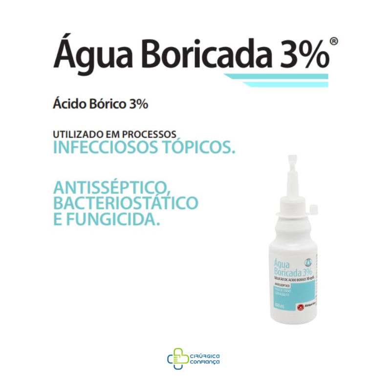 A Água Boricada 3% é indicada para controlar processos infecciosos tópicos, atuando como antisséptico, bacteriostático e fungicida.