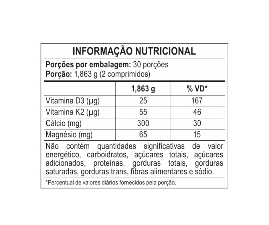 A combinação de Cálcio, D3, K2 e Magnésio potencializa a absorção e a utilização do Cálcio, auxilia a fixação do Cálcio nos ossos e inibe a calcificação vascular.