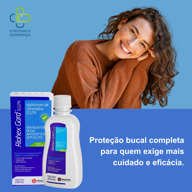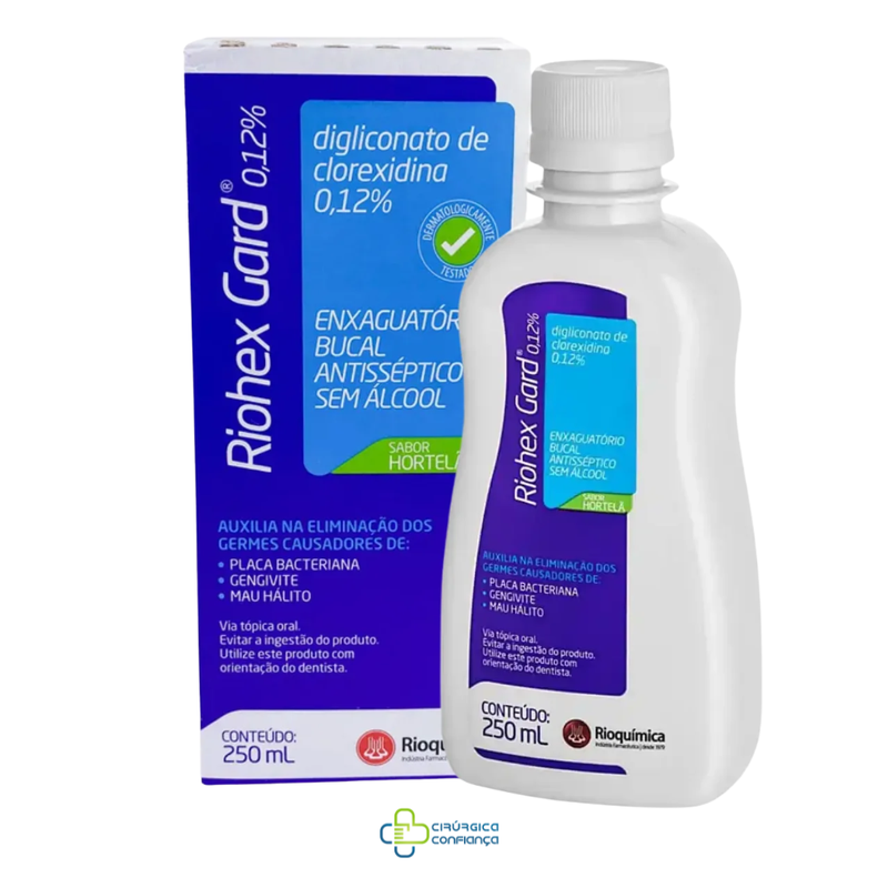 O Riohex Gard 0,12% (250ml) é um antisséptico bucal à base de digliconato de clorexidina, desenvolvido pela Rioquímica, indicado principalmente para o controle da placa bacteriana e prevenção de doenças gengivais.