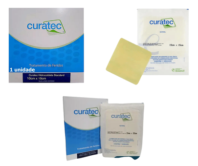 Curatec Hidrocolóide é uma cobertura estéril, composta por uma camada interna autoadesiva de hidrocolóide (CMC - carboximetilcelulose) e uma camada externa de filme de poliuretano.