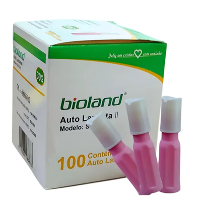Calibre 28G: Agulha fina, com profundidade de punção de aproximadamente 1,8mm, gerando fluxo baixo de sangue.