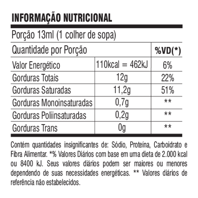O óleo de coco é um produto natural obtido da polpa do coco maduro, rico em gorduras saudáveis e amplamente utilizado na alimentação e nos cuidados com o corpo. Extraído por processos que preservam seus nutrientes, é fonte de triglicerídeos de cadeia média (TCM), que são rapidamente absorvidos pelo organismo e podem auxiliar na disposição e no metabolismo energético.